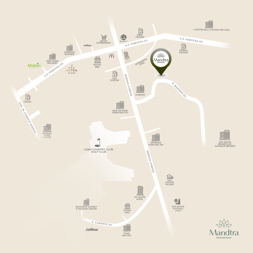 Mandtra Residences enjoys a prime location on Basubas Street, Tipolo, Mandaue City, Cebu. Situated at the heart of the city’s industrial heritage, residents benefit from excellent accessibility to key destinations: