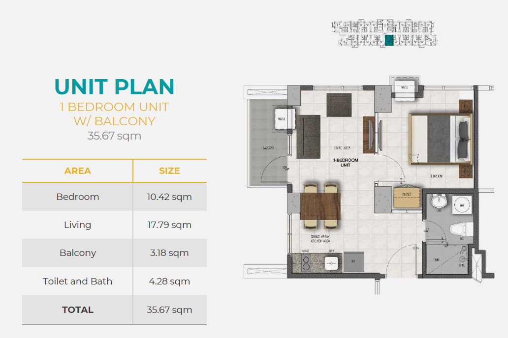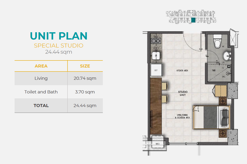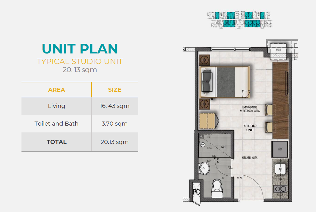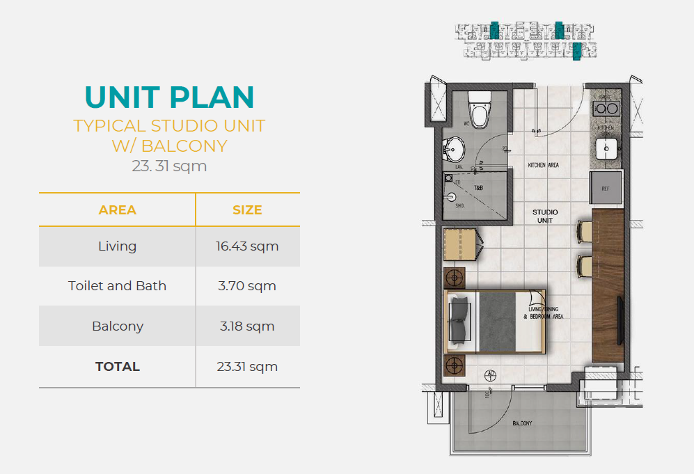Casa Mira Towers Mandaue offers unit types ranging from typical studio units at 20.13 sqm to 1-bedroom units with balcony at 35.67 sqm. All units come with floor tiles, painted wall finish, complete bathroom fixtures, and a kitchen base cabinet with countertop. Provision for cable TV, telephone, internet, aircon, and shower heater is also included.
