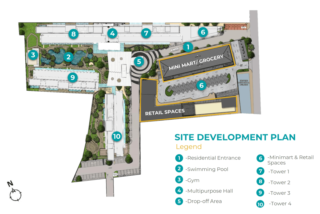 The development consists of four residential towers with a total of 1,484 units. Tower 1, with 256 units, is now open for reservation, while Tower 2 with 407 units and Tower 3 with 505 units are open for reservation as well. Tower 4, with 316 units, is also open for reservation. The project also includes a retail building, amenity area, function hall, basement parking, and a guardhouse.