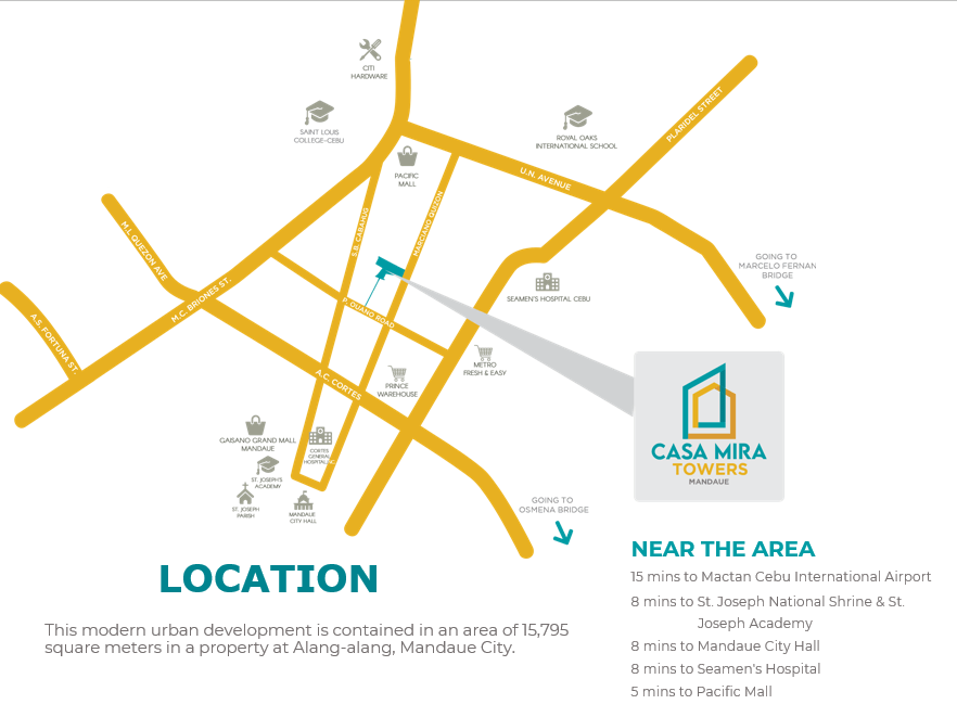 Located along Marciano Quezon St., Mandaue City, Casa Mira Towers Mandaue is just 15 minutes away from the Mactan International Airport, making it an ideal location for frequent travelers. It is also in close proximity to major establishments such as schools, malls, hospitals, and churches, making it an excellent investment opportunity for families and individuals looking for a convenient and accessible home.